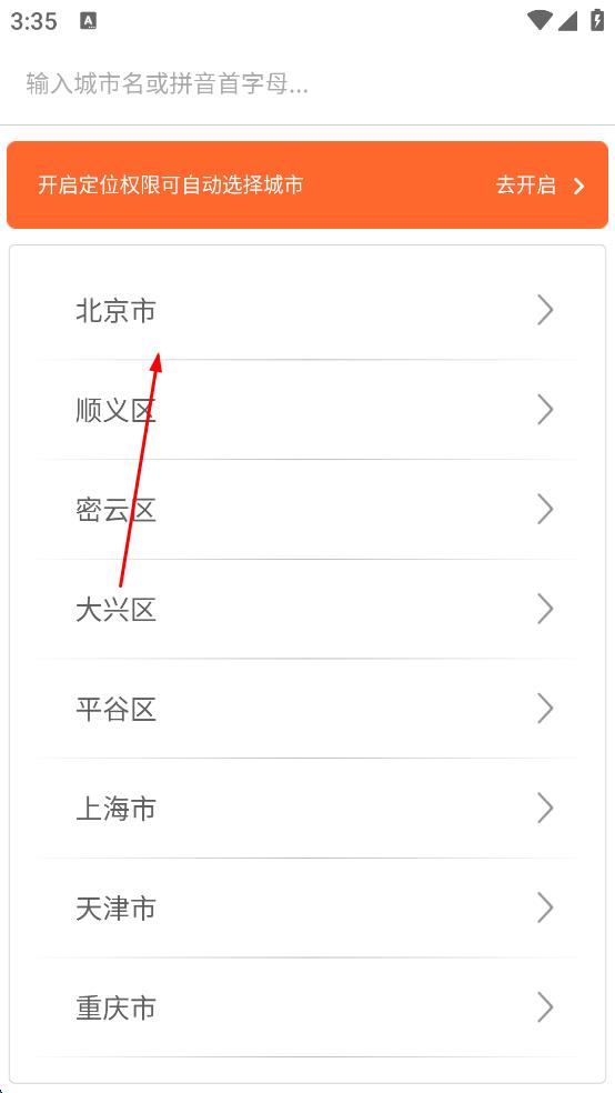 1、進(jìn)入城市選擇頁面,可在搜索欄輸入城市名或拼音首字母,也可直接點(diǎn)擊列表中目標(biāo)城市如“北京市”,開啟定位權(quán)限能自動(dòng)選城市,按需操作選定城市。