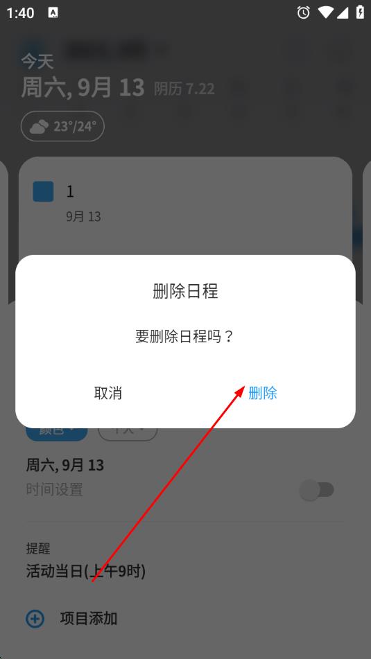 4、在彈出的刪除日程確認(rèn)窗口中,點擊刪除選項,即可成功刪除該事件。
