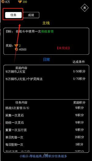 3、任務(wù)系統(tǒng)包含主線劇情與日常修行目標(biāo),完成可獲得修為提升與稀有道具獎勵。
