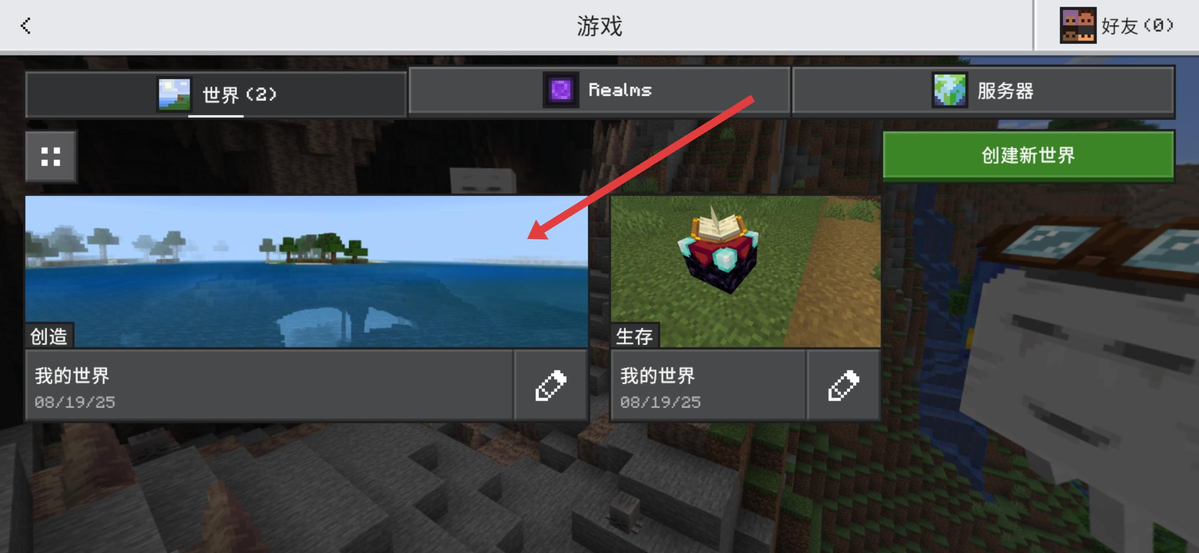 1、在游戲的主界面,先選擇自己任意已創(chuàng)建的世界如創(chuàng)造模式的世界,點擊進入游戲的場景。