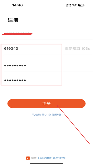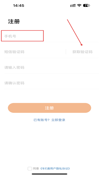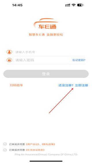 1、打開平安車E通APP,進(jìn)入時(shí)點(diǎn)擊右側(cè)立即注冊。