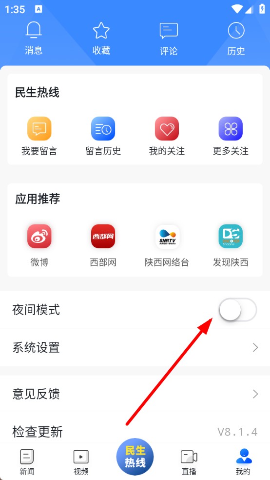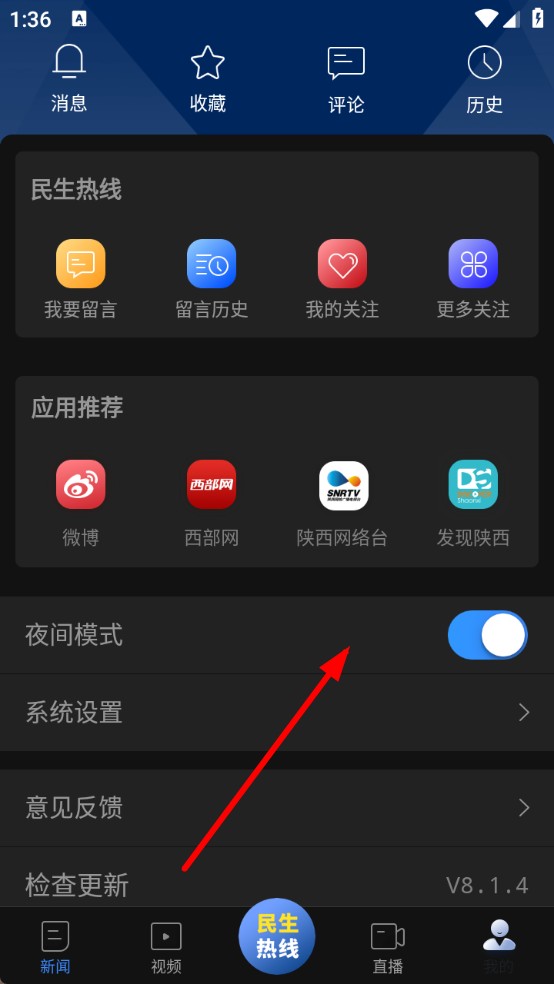 3、點(diǎn)擊夜間模式的開關(guān)按鈕,將其切換至開啟狀態(tài),即可成功開啟夜間模式。