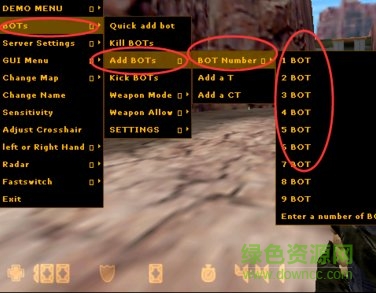 2.然后點擊“BOTS”選擇“ADD BOTS”可以選擇增加機器人數(shù)量,以及類別和刪除機器人等(add_ct為反恐精英;add_t為恐怖分子)。