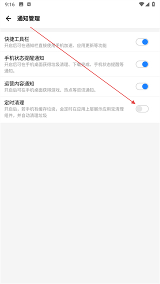 4、在通知管理頁(yè)面找到定時(shí)清理選項(xiàng),點(diǎn)擊其右側(cè)的開關(guān)按鈕。