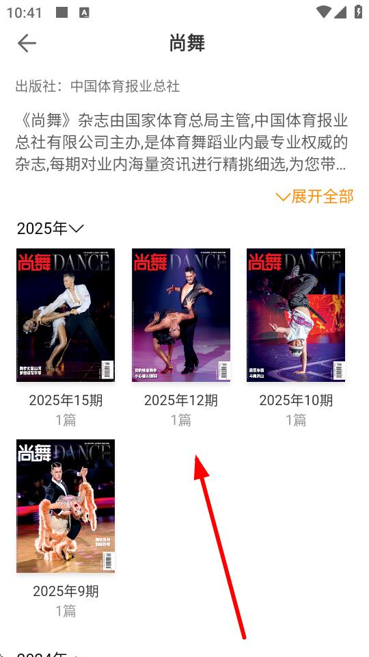3、進(jìn)入尚舞期刊頁(yè)面后,選擇具體的期刊期數(shù),如點(diǎn)擊2025年12期。