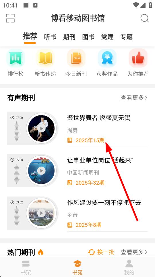 2、在書(shū)苑界面的推薦欄目下,找到有聲期刊板塊,選擇想要聽(tīng)的期刊,比如點(diǎn)擊尚舞2025年15期。