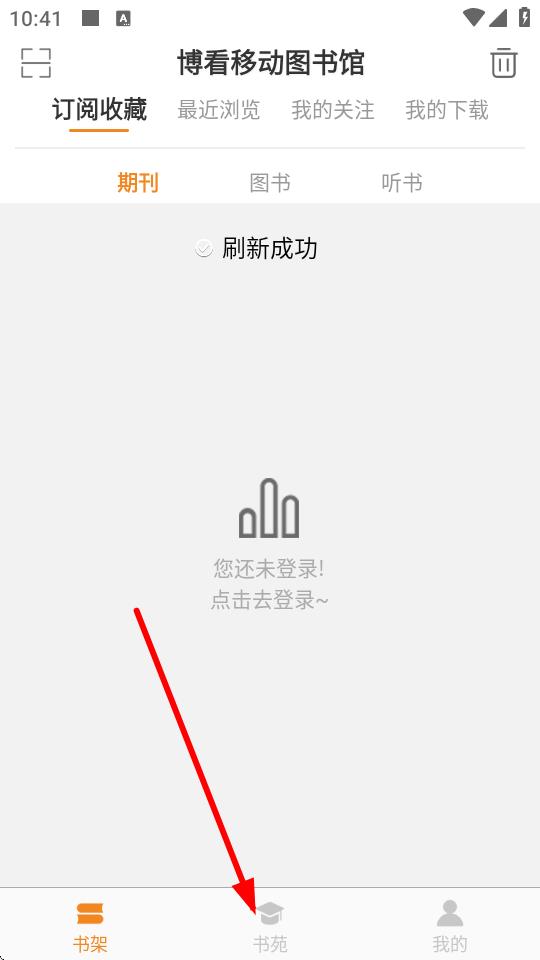 1、打開(kāi)博看移動(dòng)圖書(shū)館APP,點(diǎn)擊底部導(dǎo)航欄中的書(shū)苑按鈕,進(jìn)入書(shū)苑界面。