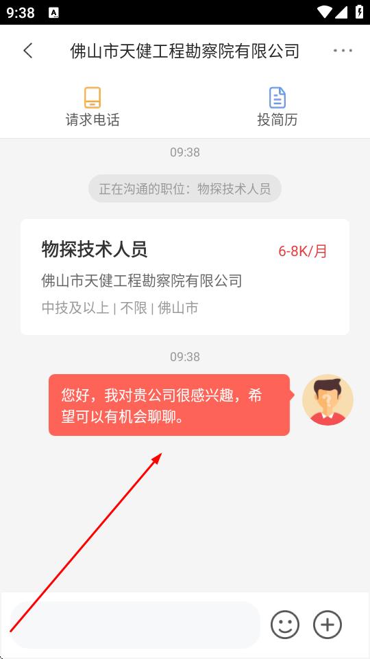 4、進(jìn)入聊天界面后,會(huì)自動(dòng)給招聘方發(fā)送打招呼語。