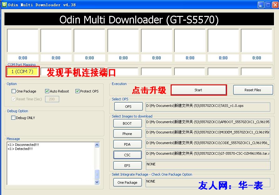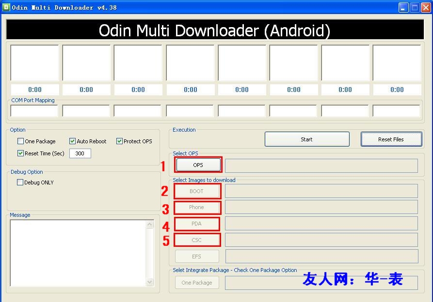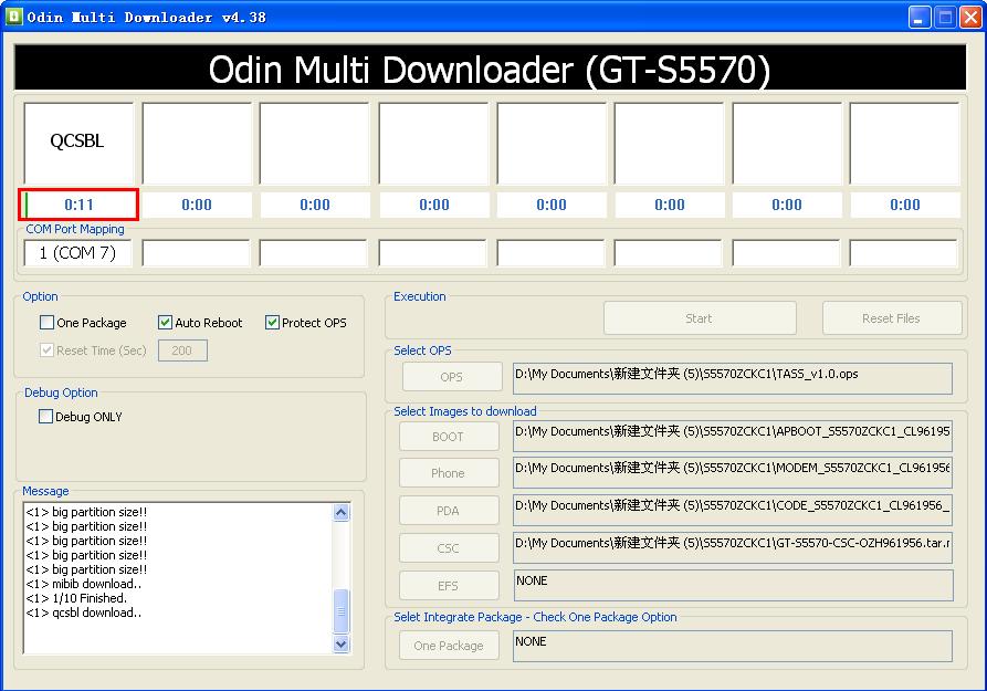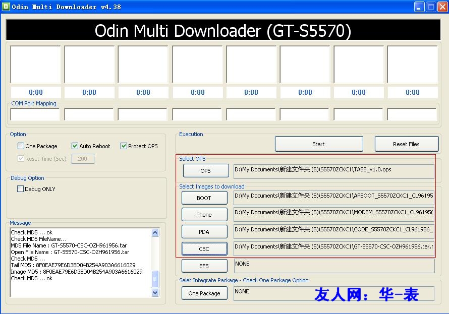 4 而后的其他4個(gè)選項(xiàng)分別對(duì)應(yīng)后綴為md5的文件,BOOT:APBOOT_S5570ZCKC1_CL961956_REV02_user_low_true.tar.md5,Phone:MODEM_S5570ZCKC1_CL961956_REV02.tar.md5,PDA:CODE_S5570ZCKC1_CL961956_REV02_user_low_true.tar.md5,CSC:GT-S5570-CSC-OZH961956.tar.md5。
