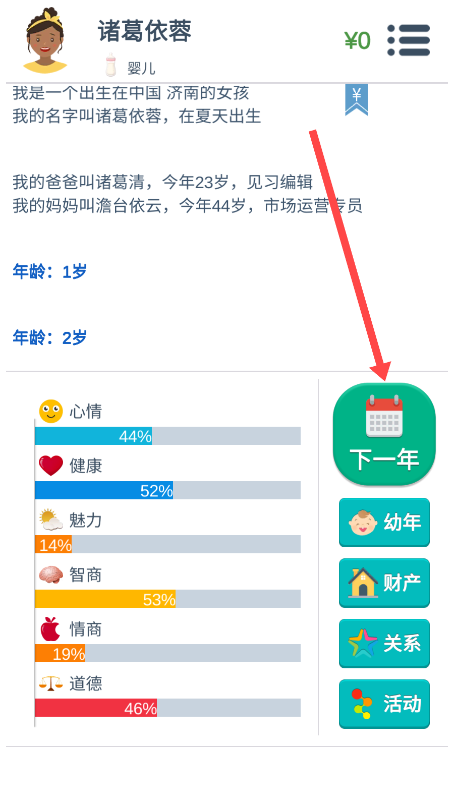 2、在游玩進(jìn)行過(guò)程中,點(diǎn)擊【下一年】按鈕,能夠加快角色的成長(zhǎng)進(jìn)程,快速感受角色的發(fā)展變化,推進(jìn)游玩進(jìn)度。
