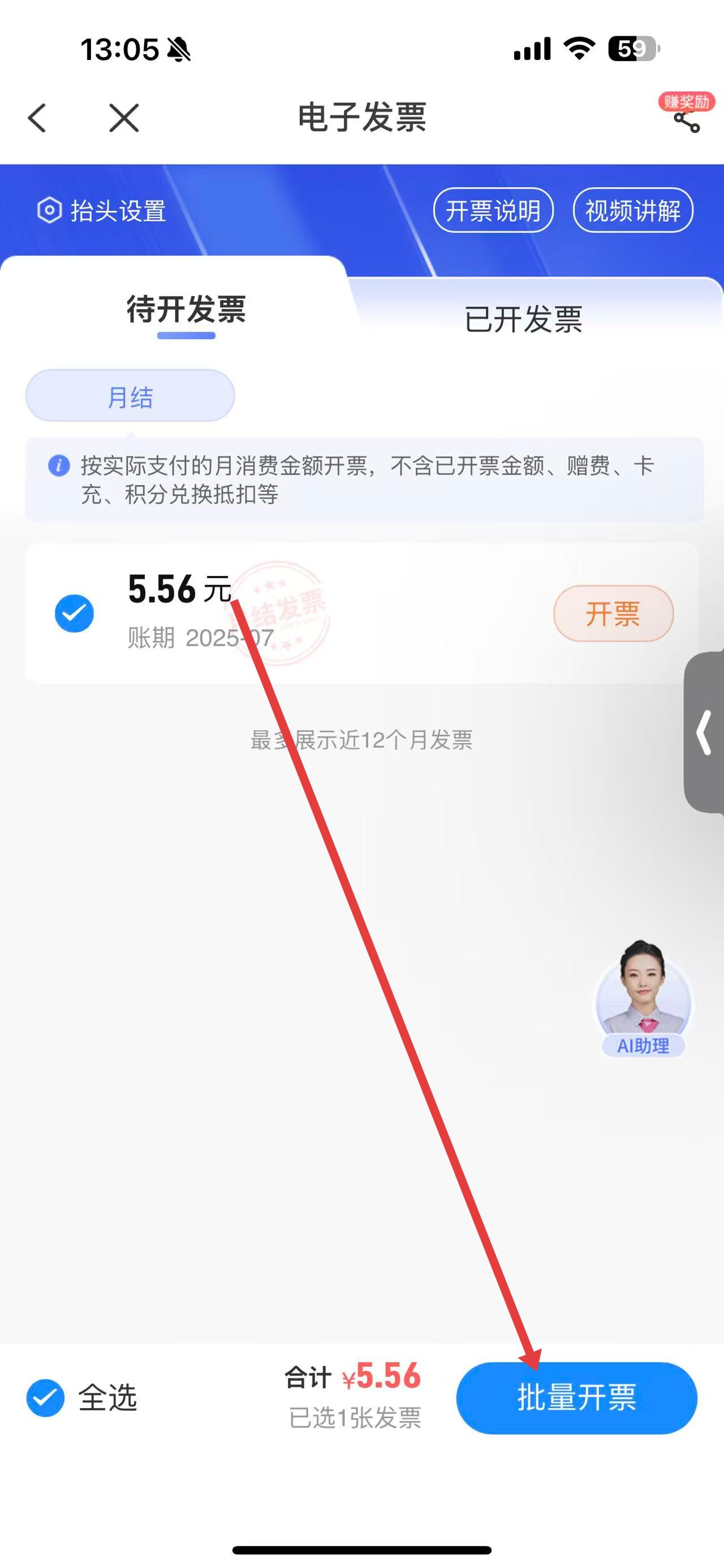 3、在電子發(fā)票界面的待開(kāi)發(fā)票欄目下,勾選需要開(kāi)票的賬期金額,點(diǎn)擊批量開(kāi)票按鈕,即可完成電子發(fā)票開(kāi)具操作。