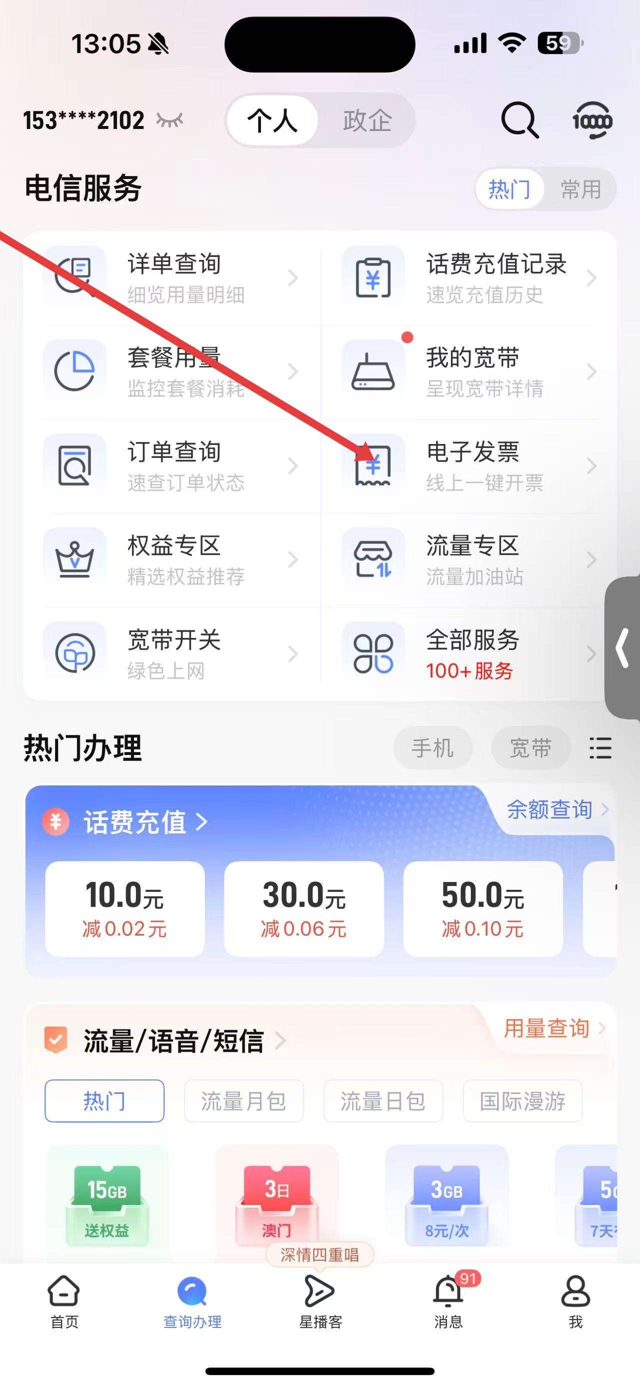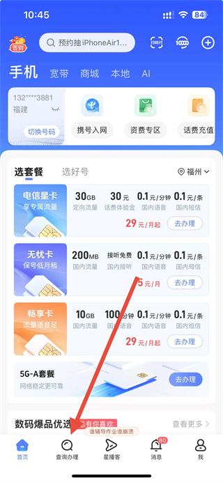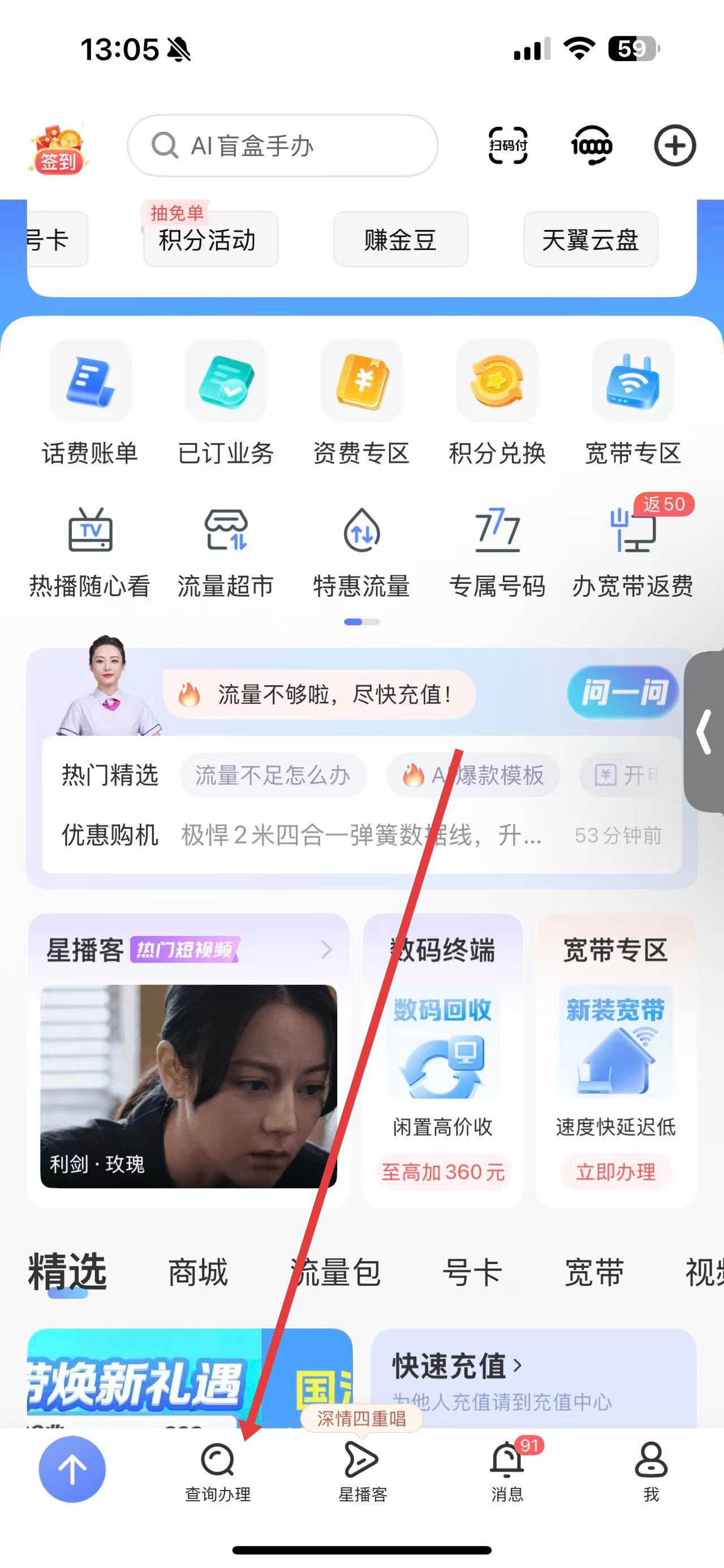 1、打開(kāi)中國(guó)電信app,在首頁(yè)點(diǎn)擊下方查詢辦理選項(xiàng),進(jìn)入查詢辦理頁(yè)面。