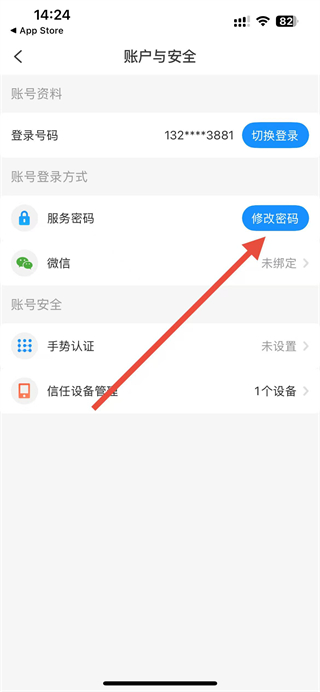 4、在賬戶與安全頁(yè)面,點(diǎn)擊服務(wù)密碼右側(cè)的修改密碼按鈕,按照提示操作即可完成服務(wù)密碼修改。