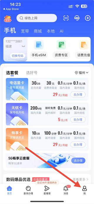 1、打開(kāi)中國(guó)電信APP,在首頁(yè)點(diǎn)擊右下角我選項(xiàng)。