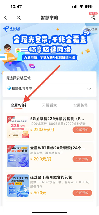 4、點(diǎn)擊全屋WiFi選項(xiàng),選擇心儀的套餐,點(diǎn)擊立即預(yù)約即可完成全屋WiFi安裝預(yù)約。