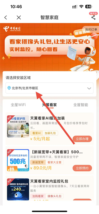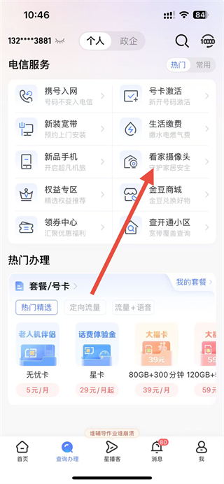 2、在查詢辦理頁(yè)面,找到看家攝像頭選項(xiàng)并點(diǎn)擊,進(jìn)入智慧家庭頁(yè)面。