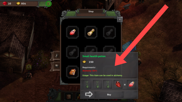 3、展示商店中的“Smallhealthpotion”,售價(jià)150金幣,可恢復(fù)15%生命值且用于煉金術(shù),玩家可根據(jù)需求點(diǎn)擊【Buy】購買,保障角色狀態(tài)。
