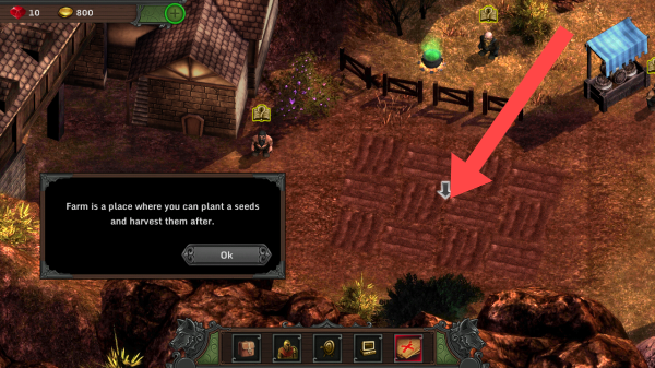 2、提示“Farmisaplacewhereyoucanplantseedsandharvestthemafter”,玩家可前往箭頭指示的農(nóng)場區(qū)域進(jìn)行播種與收獲,以此獲取資源推動(dòng)游戲進(jìn)程。
