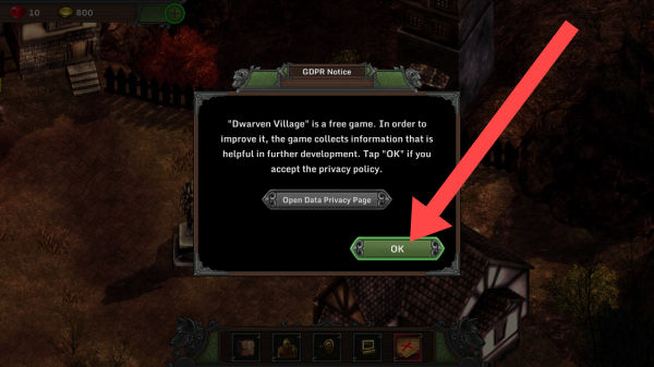 1、顯示游戲《DwarvenVillage》彈出GDPR通知,提示游戲免費(fèi)且收集信息用于改進(jìn),點(diǎn)擊【OK】接受隱私政策即可繼續(xù)游戲,這是開啟游戲的必要操作。