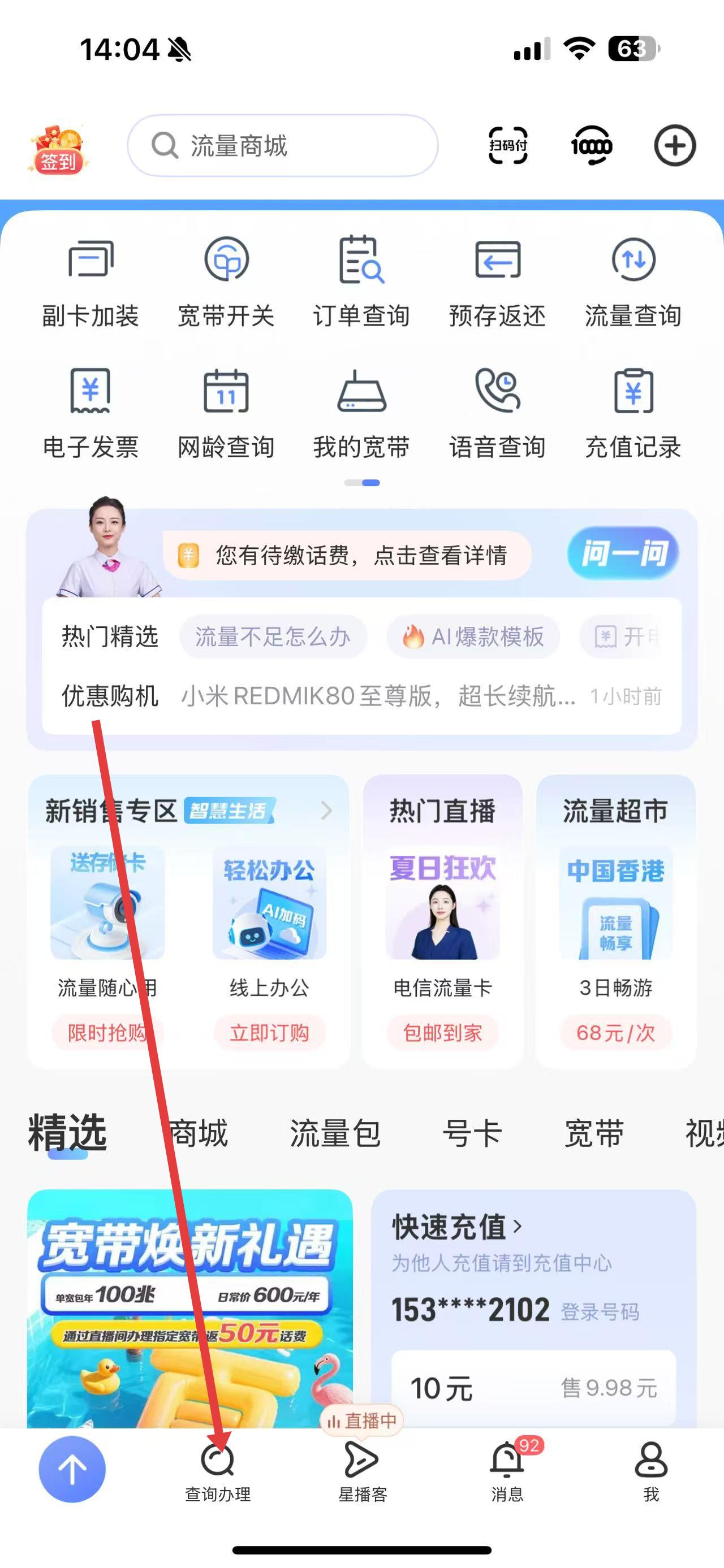 1、打開中國電信APP,點擊底部導(dǎo)航欄中的查詢辦理,進入電信服務(wù)相關(guān)界面。
