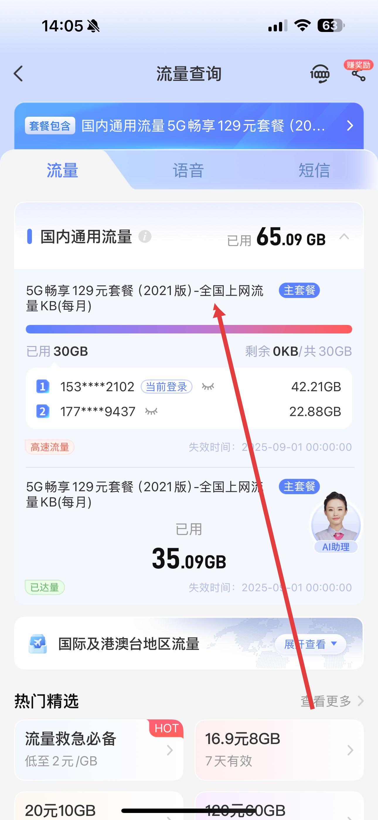 3、在新頁面中,點擊流量選項卡,即可查看套餐內(nèi)國內(nèi)通用流量的已用和剩余情況,還能看到其他流量詳情。