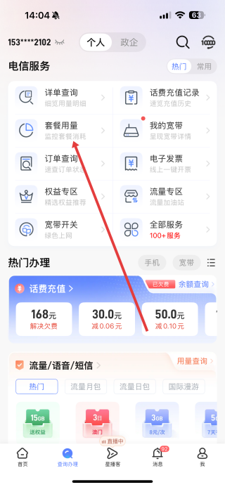 2、在電信服務(wù)板塊里,點擊套餐用量選項,進入套餐使用情況查詢頁面。