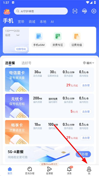1、打開中國電信app,點擊底部導(dǎo)航欄中的我選項。