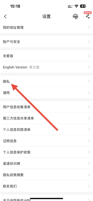 2、在設(shè)置界面里,找到隱私選項并點擊,進入隱私設(shè)置界面。