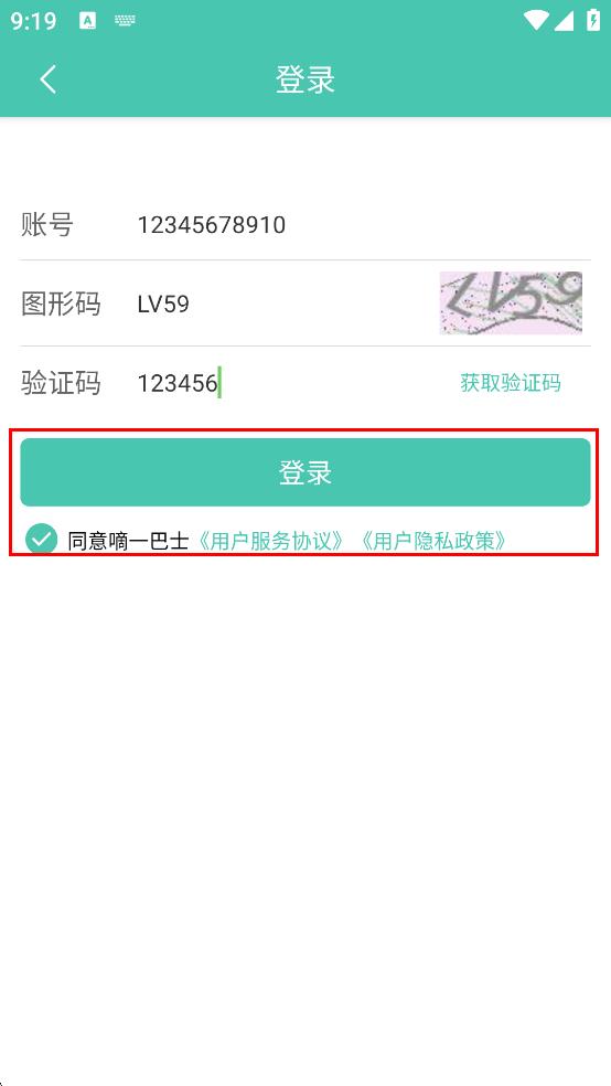 4、勾選同意嘀一巴士用戶服務協(xié)議,用戶隱私政策,然后點擊綠色的“登錄”按鈕,完成登錄。