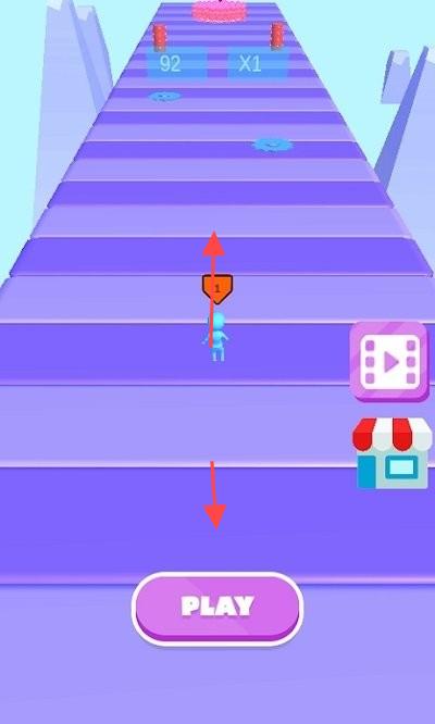 1、玩家操控角色在紫色跑道上向前奔跑,通過操作躲避跑道上的障礙。