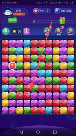 2、在游戲主界面,點擊圖示區(qū)域進行消除操作,通過消除彩色方塊完成任務(wù),享受消除樂趣,積累游戲分?jǐn)?shù)。