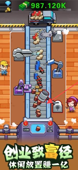 3、創(chuàng)業(yè)致富經(jīng)玩法,畫面中有工廠流水線,通過機械臂等元素體現(xiàn)休閑放置賺錢的模式。