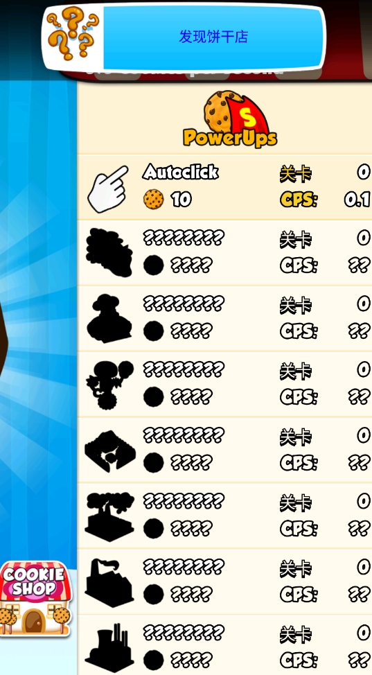 3、進入PowerUps界面,使用資源購買Autoclick等道具,助力后續(xù)關(guān)卡推進。