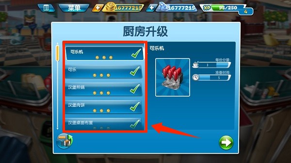 3、升級(jí)廚房設(shè)備,提高效率與菜品質(zhì)量,解鎖高級(jí)菜譜。
