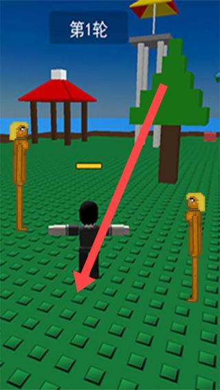 2、進入“第1輪”游戲場景后,操控黑色角色在綠色方塊地面上,依照箭頭方向前進,注意躲避或收集場景中的物品,適應(yīng)基礎(chǔ)操作。