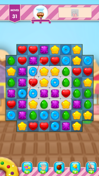 3、在游戲關(guān)卡,滑動點擊相同糖果進行消除,朝著目標分數(shù)努力,同時留意步數(shù)限制,合理規(guī)劃每一步操作。