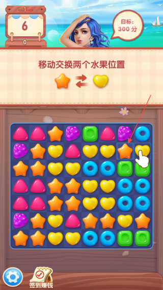 1、進入游戲界面后,按照提示【移動交換兩個水果位置】進行操作,這是消除游戲的基礎(chǔ)玩法,通過交換達成消除條件。