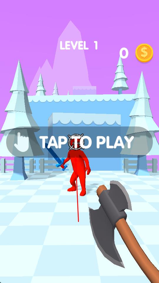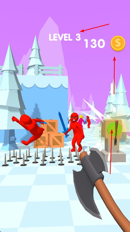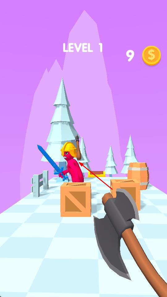 1、玩家通過點擊屏幕操控視角和斧頭投擲方向,對前方紅色敵人進行攻擊。