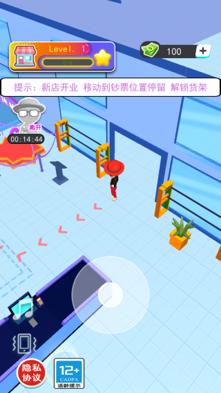 1、提示文字【新店開業(yè)移動到鈔票位置停留解鎖貨架】引導玩家進行初始操作,推進店鋪經(jīng)營進程,玩家需按提示完成操作來解鎖貨架。
