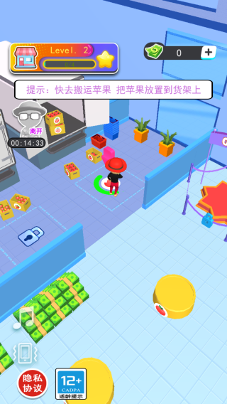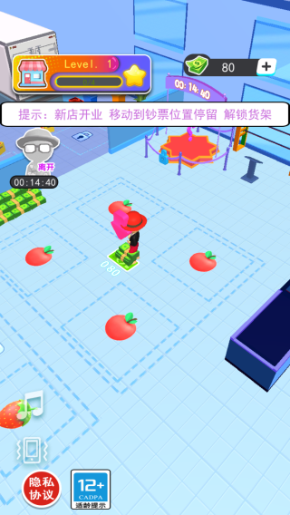 2、周圍有類似水果(如番茄)的圖標,場景為店鋪內(nèi)部,圍繞店鋪經(jīng)營展開,玩家需按提示完成操作以解鎖貨架,開啟經(jīng)營環(huán)節(jié)。