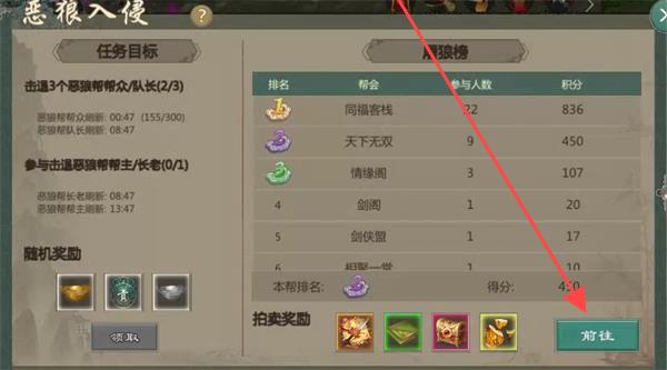 2、在活動(dòng)界面,點(diǎn)擊“惡狼入侵”活動(dòng)參與任務(wù),按照任務(wù)目標(biāo)(如擊潰惡狼幫眾/隊(duì)長)努力,參考惡狼榜排名、參與人數(shù)和積分情況,爭(zhēng)取隨機(jī)獎(jiǎng)勵(lì)。