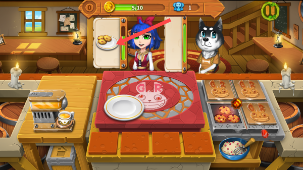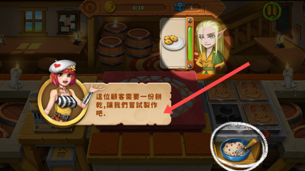 3、完成餅干制作后,將做好的餅干按圖示放到顧客對(duì)應(yīng)的位置如箭頭所指的餅干圖標(biāo)處,完成訂單。