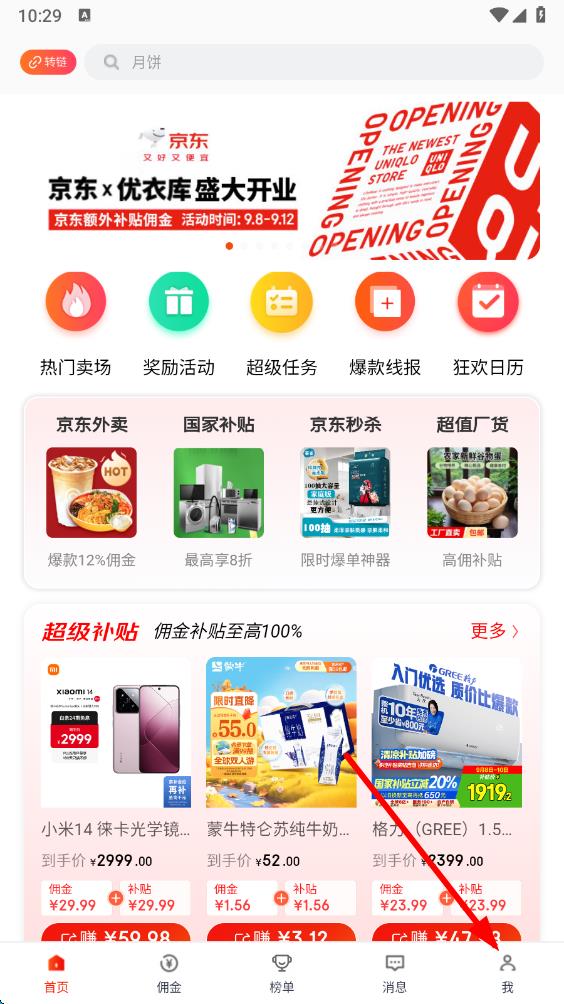 1、打開(kāi)京粉app進(jìn)入首頁(yè),點(diǎn)擊底部導(dǎo)航欄最右側(cè)我選項(xiàng),進(jìn)入個(gè)人頁(yè)面。