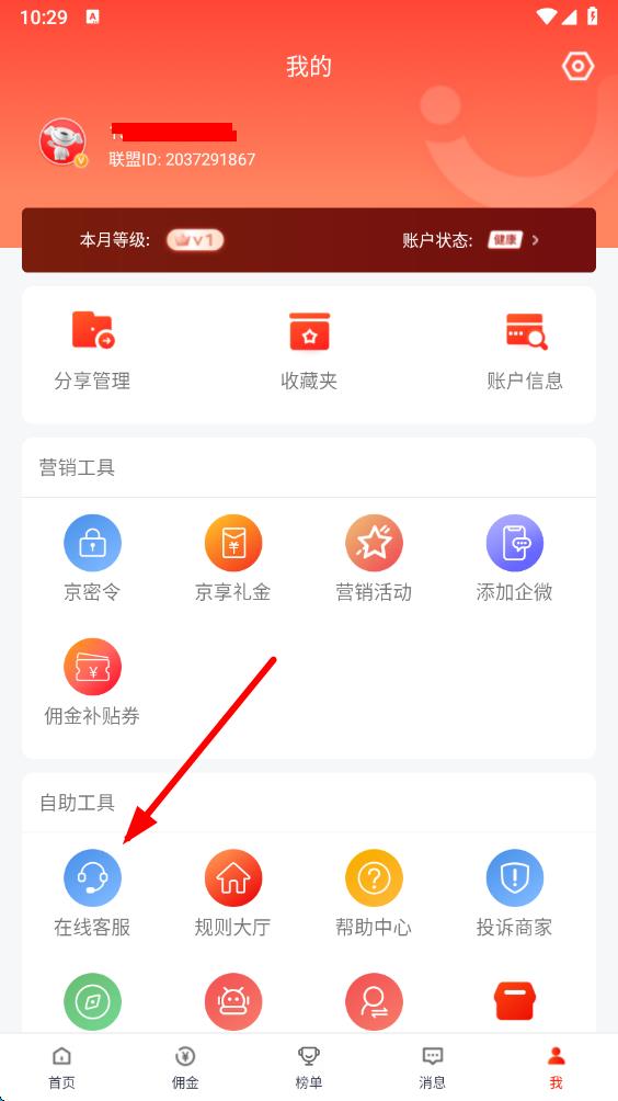 2、在個(gè)人頁(yè)面下方找到自助工具板塊,點(diǎn)擊其中的在線客服選項(xiàng),進(jìn)入與京東聯(lián)盟客服的對(duì)話界面。