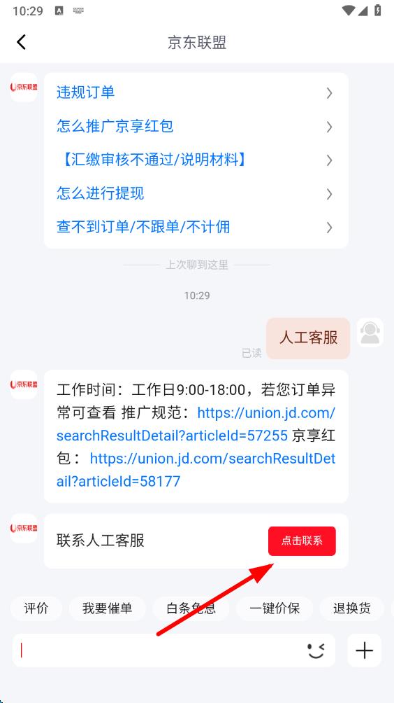 4、按照回復(fù)提示,點(diǎn)擊聯(lián)系按鈕,在工作日的時(shí)間段內(nèi),即可成功聯(lián)系到京粉人工客服。