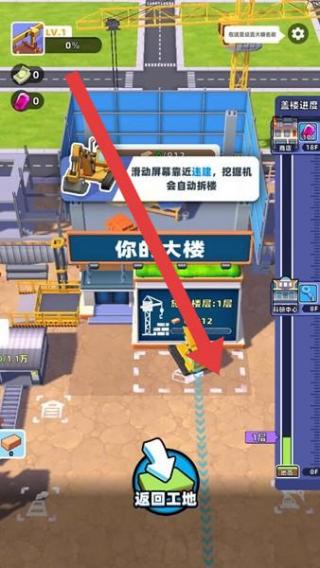 2、進入建筑工地,滑動屏幕靠近建筑,挖掘機會自動拆除,按提示操作推進工地建設,完成拆除任務。