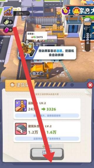 3、在建筑隊伍界面,查看建筑隊等級,點擊紅色箭頭指向的升級按鈕,消耗資源提升建筑隊等級,增強能力。
