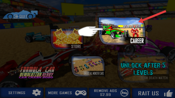 1、進(jìn)入方程式車禍模擬器主頁(yè)面,點(diǎn)擊【CAREER】進(jìn)入職業(yè)模式,開(kāi)啟你的賽車生涯挑戰(zhàn)之旅。