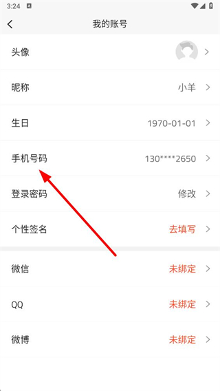 3、進(jìn)入我的賬號頁面后,點(diǎn)擊手機(jī)號碼選項(xiàng)。