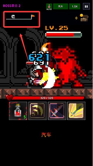 3、在上邊是自己的人物,自己可操控也可自動(dòng)戰(zhàn)斗,右上角有個(gè)寶箱,寶箱緊挨著是自己得到的金幣數(shù)量,紅旗代表最后的地方人頭到哪里了你就過關(guān)了。